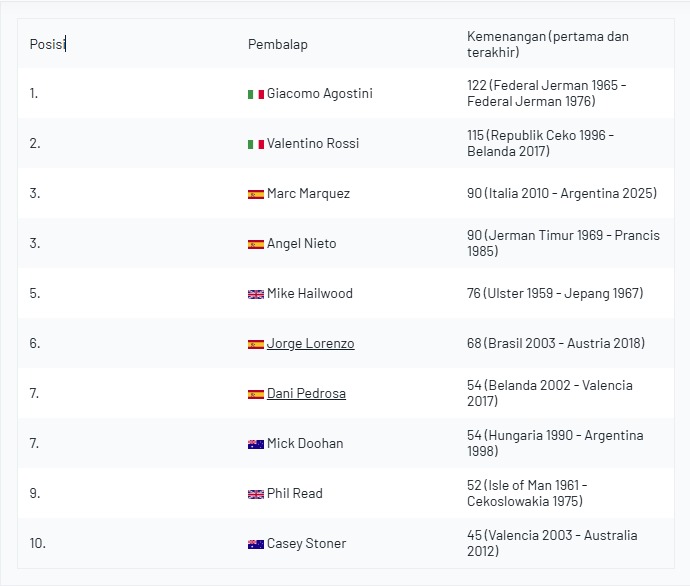 Untuk jumlah kemenangan Marquez sekarang berada di urutan ketiga. urutan kedua ditempati oleh Valentino Rossi (115) dan pertama giacomo agostini (122).