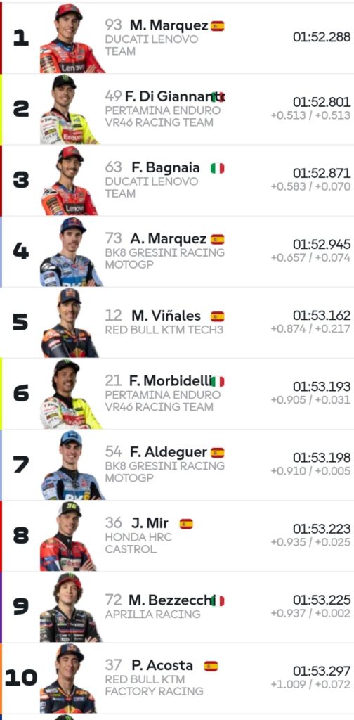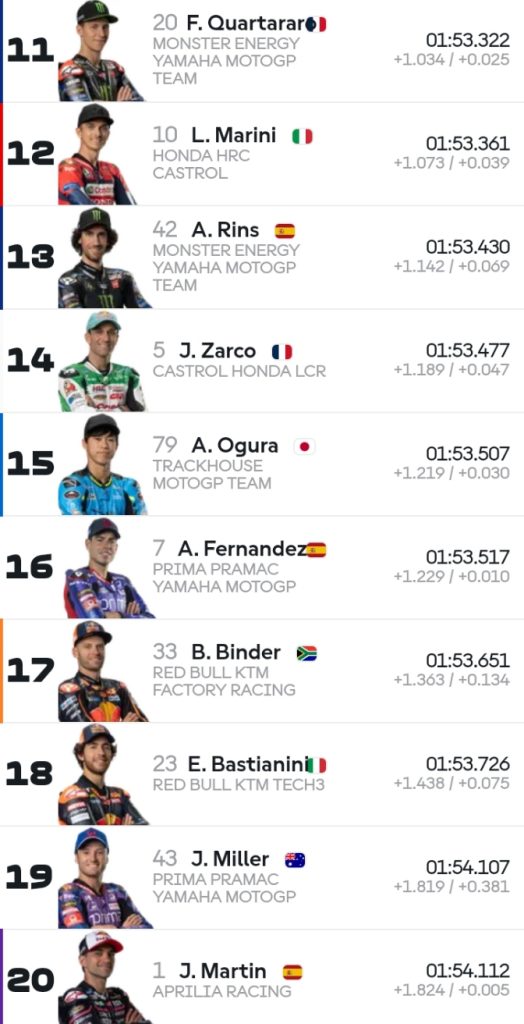 Sedangkan juara dunia 2024 Jorge Martin terlihat hati-hati dengan cideranya di pergelangan tangan kiri maka itu Martin di luar 10 besar perolehan catatan waktunya. Martin melahap lab sebanyak 14 putaran. Martin Tertinggal 1,8 detik dari Marquez.
