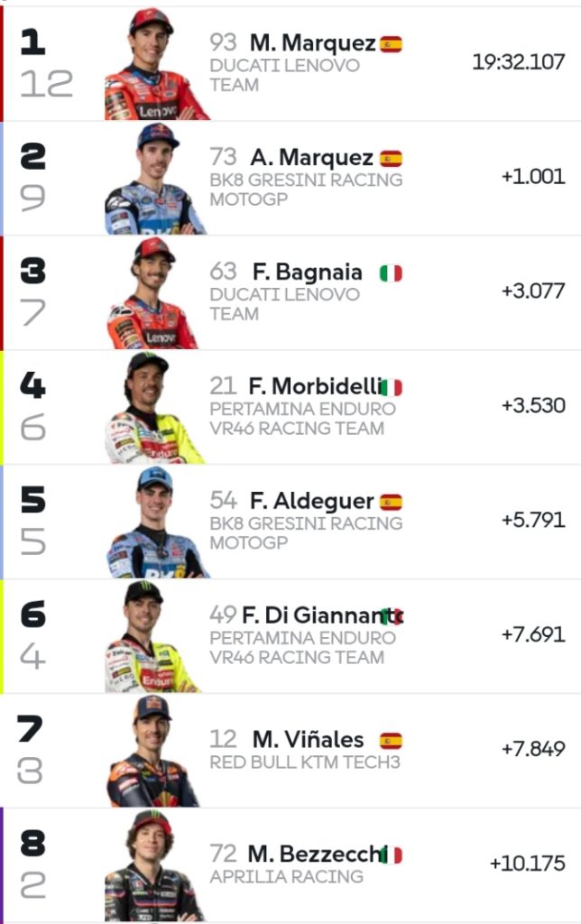 Setelah itu Marquez nyaman memimpin di depan diikuti Posisi kedua yaitu adiknya Alex Marquez. Balapan setelah itu tidak seru sama sekali karena hasil balapan sudah bisa ditebak yaitu Marquez, Alex Marquez dan Bagnaia