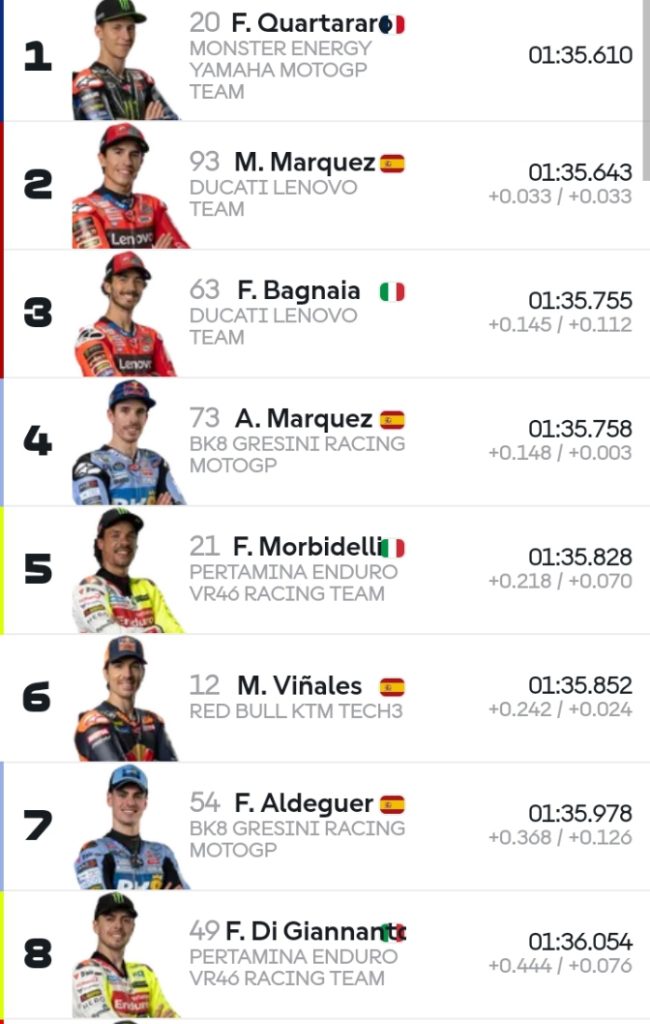 Namun Quatararo dan timnya mempunyai rencana lain yang akhirnya bisa mengalahkan semua pembalap Ducati. Pembalap Prancis itu mencatatkan waktu 1:35,610 detik. Kecapean itu memecahkan rekor sebelumnya.