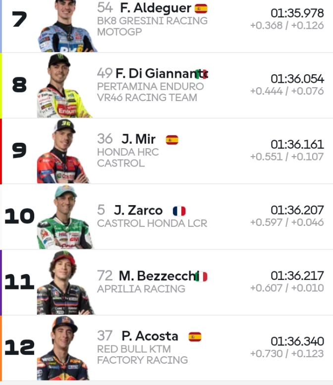 Pecco Bagnaia hanya bisa menempati posisi ketiga. Di bawah Marquez yang satu grid di atasnya yaitu di posisi 2. Alex Marquez yang biasanya langganan di baris kedua kini hanya menempati posisi keempat.