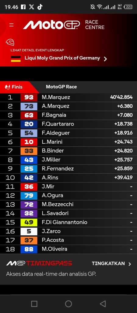 GOOOO!!!! Seperti biasa, Marquez memimpin ditikungan pertama diikuti Bezzecci dan Digiantonio. Alex keempat dan Bagnaia ketujuh.